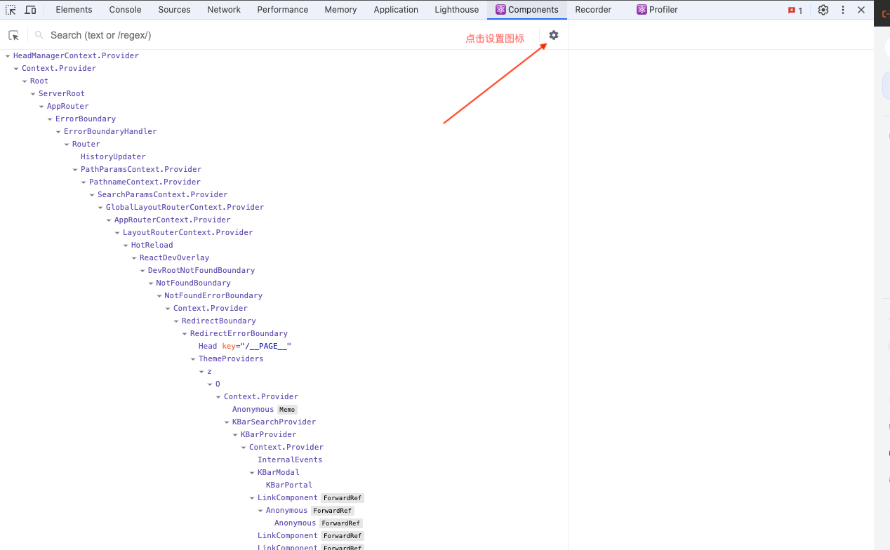 首先,你需要在浏览器中安装React 开发工具。安装完成后,打开开发工具,进入 components 选项卡,点击 settings 图标。