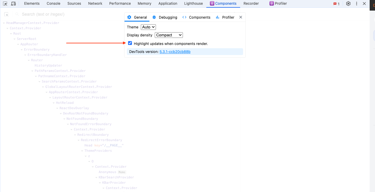 接着,在开发工具的 general setting 选项卡中启用 Highlight updates when components render(组件渲染时突出显示更新)。